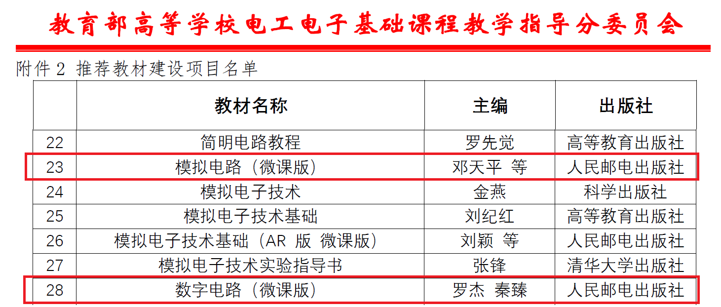 邓天平教师主编的《模拟电路(微课版)》和罗杰、秦臻教师主编的《数字电路(微课版)》获推荐教材建设项目。