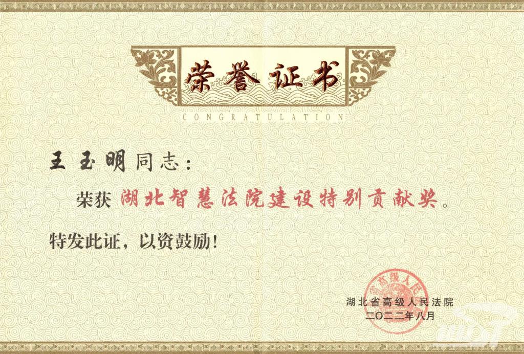 王玉明副教授在湖北省高级人民法院挂职期间敢于担当、主动作为,积极参与湖北法院信息化建设工作,为打造智慧法院建设“湖北模式”做出了重要贡献;并决定授予王玉明同志“湖北智慧法院建设特别贡献奖”。