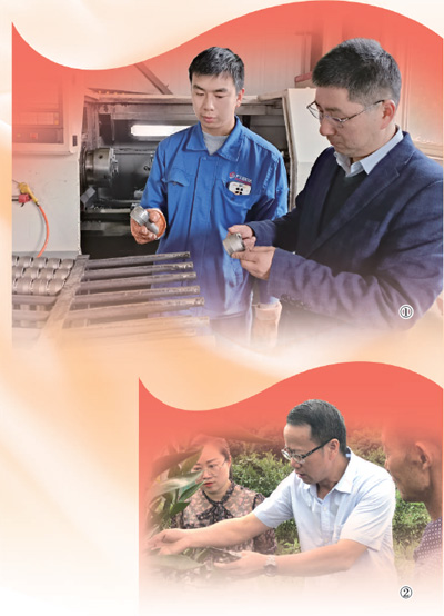 图①:湖北汽车工业学院教授孙海明(右)担任汽车公司“科技副总”,在车间指导零件精密加工。