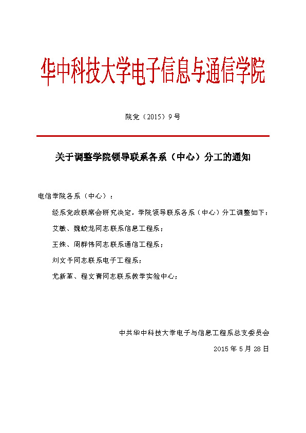 院党(2015)9号 关于调整学院领导联系各系(中心)分工的通知