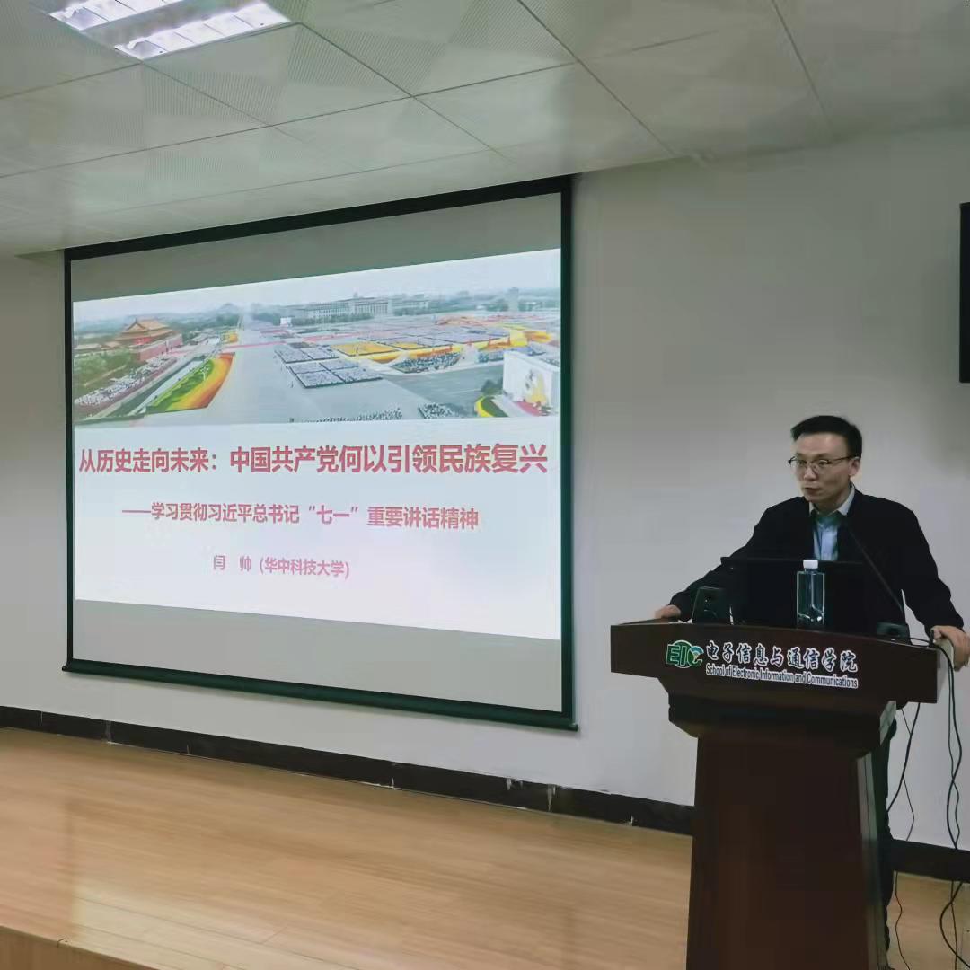 闫帅副教授以《从历史走向未来:中国共产党何以引领民族复兴——学习贯彻习近平总书记“七一”重要讲话精神》为题,从“自豪”“自信”“自觉”“自强”四个部分分别概括阐释了“一个庄严宣告”“四个伟大成就”“伟大建党精神”和“九个必须”的内涵实质,回答阐明了中国共产党为什么能够成功,怎样才能继续成功。从历史方位、重大意义、深远影响三个方面进行深刻阐述,指出习近平总书记“七一”重要讲话科学概括了中国共产党百年宝贵经验和重要启示,是站在历史新起点的政治宣言和行动纲领,为全党全国各族人民向第二个百年奋斗目标进军指明了前进方向,提供了根本遵循。