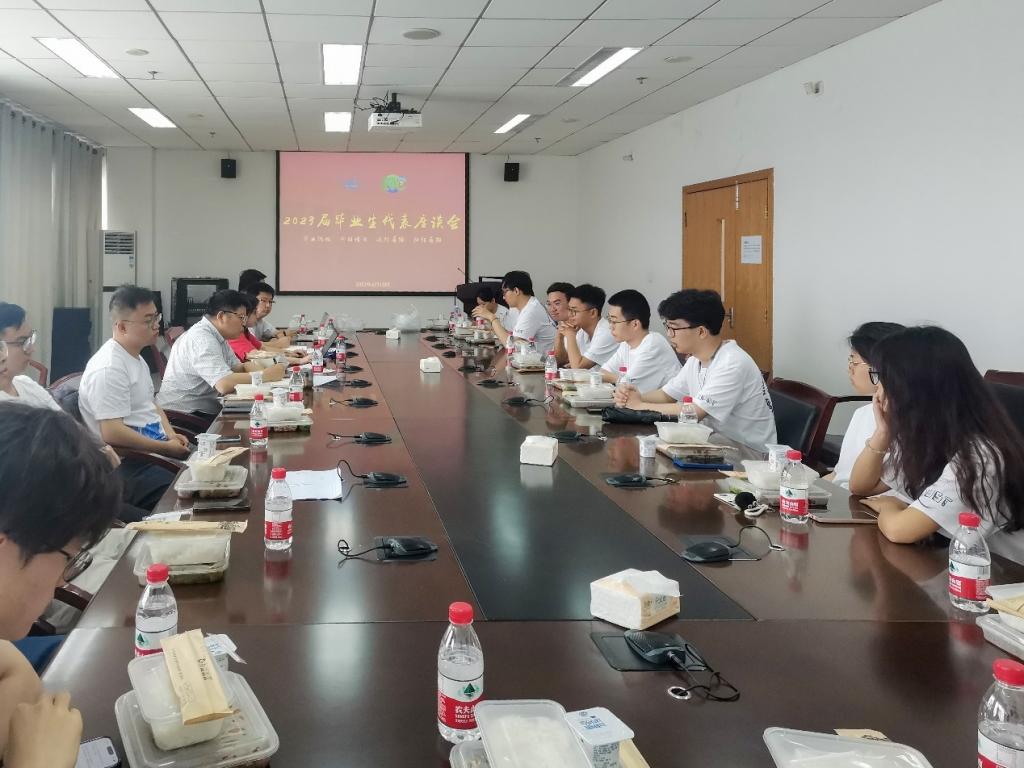 2023届毕业生代表座谈会在东十七楼D304会议室召开。学院党委书记葛茜、院长邱才明、副院长杨铀、辅导员及16名本硕博毕业生代表参加本次座谈会,会议由党委副书记陈世英主持。