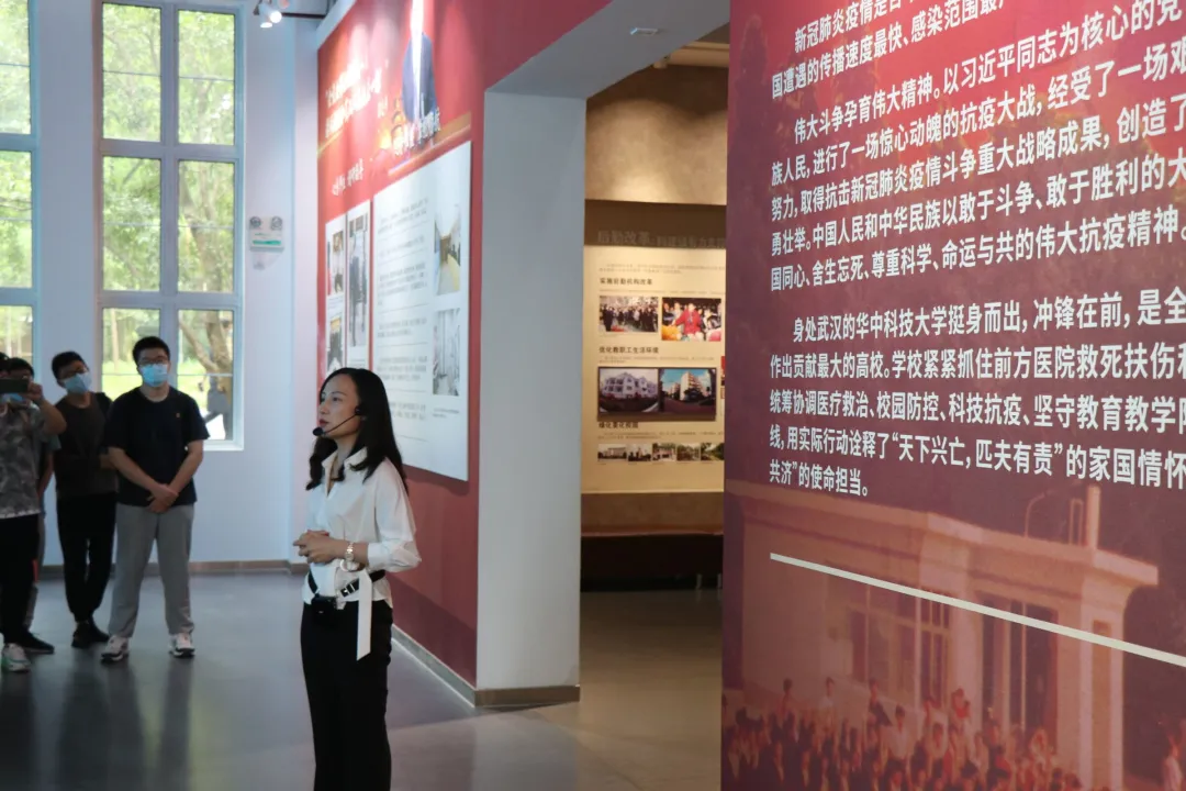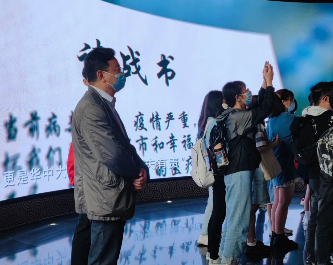 在展览的入口,粟老师带领学员们观看纪录片,回顾抗疫期间武汉以及学校各战线可歌可泣的战疫故事,认真体会抗疫精神内涵。