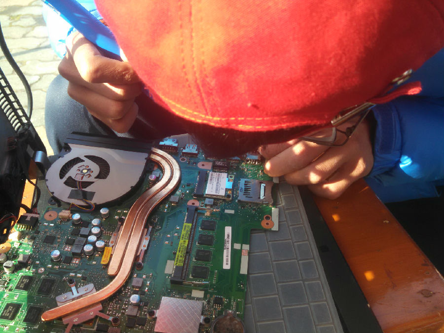 小红帽队员李楠作为后来新加入的队员,也一直表现优秀,积极参与志愿服务,活动热情很高。图中为小红帽队员李楠在修理、焊接笔记本的USB接口。