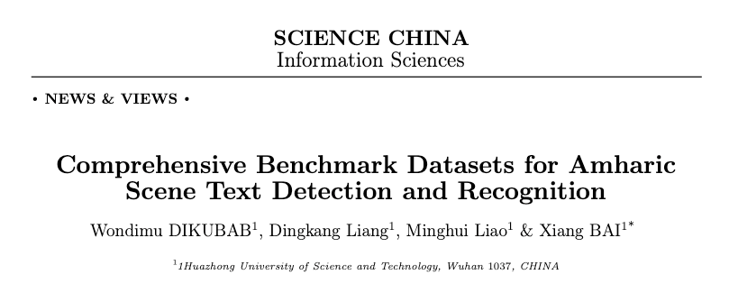 2019级来华留学博士研究生王兴(WONDIMU GEBRE DIKUBAB,埃塞俄比亚籍),发布了首个阿姆哈拉语场景文字检测与识别综合公共数据集和初步的算法解决方案,其论文“Comprehensive Benchmark Datasets for Amharic Scene Text Detection and Recognition”发表在国内计算机领域顶级期刊《SCIENCE CHINA Information Sciences》上。