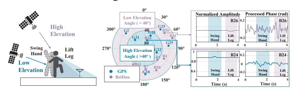 在该论文中,王巍教授团队详细介绍了近期研究设计的一种利用环境中的GNSS卫星信号感知周围人员活动的泛在无线感知技术,可实现对周围人员的动作感知,轨迹追踪乃至细粒度的呼吸感知。
