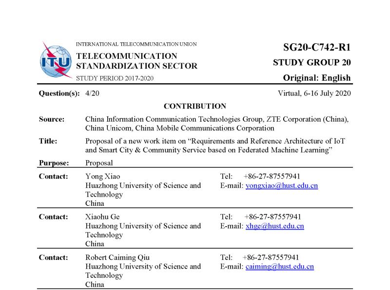 肖泳教授、葛晓虎教授和邱才明教授牵头,联合中国信科、中兴通讯、中国联通和中国移动向国际电信联盟(ITU-T)提交的国际标准提案“面向物联网和智慧城市/社区的联邦机器学习需求及参考架构”(Requirements and Reference Architecture of IoT and Smart City & Community Service based on Federated Machine Learning)获得批准正式立项。该标准提案是全球首个面向物联网与智慧城市的联邦学习参考架构。