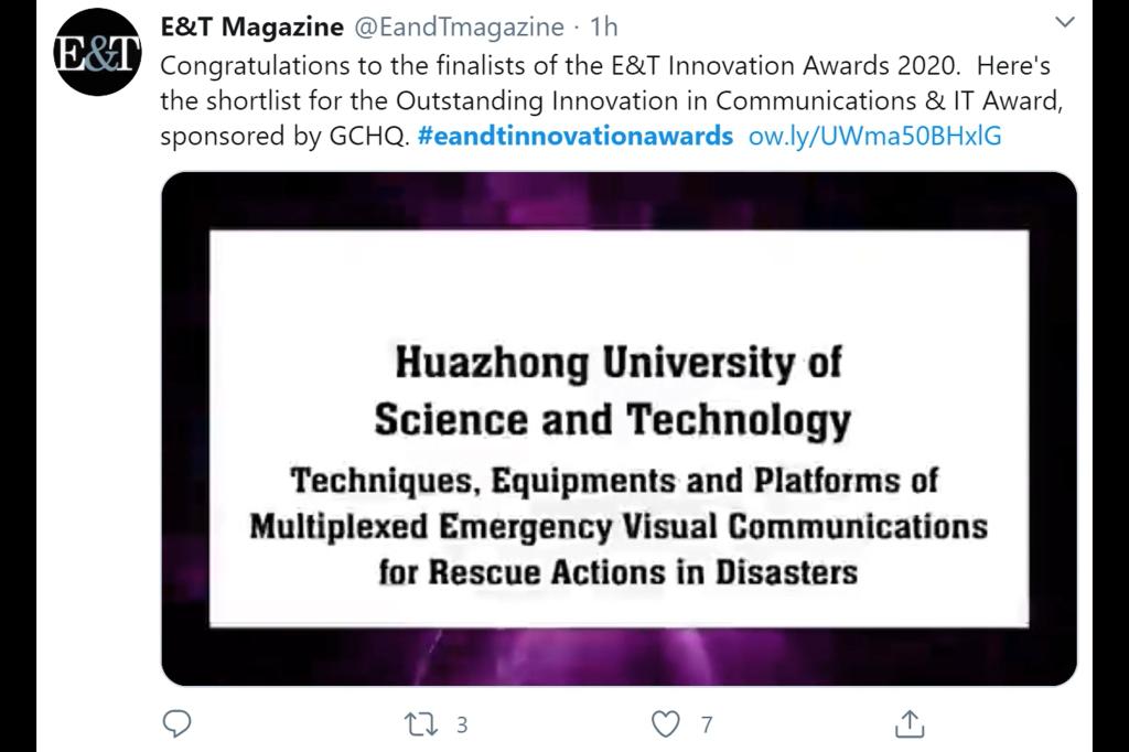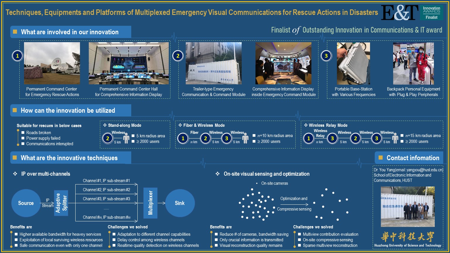 杨铀副教授带领的团队获得“通信与信息技术”杰出创新奖的提名。杨铀副教授及其团队的创新研究成果“Techniques, Equipments and Platforms of Multiplexed Emergency Visual Communications for Rescue Actions in Disasters”,此项研究成果是视觉感知与通信工程技术相结合的产物,重点解决在灾害救援现场断电、断网、断路等极端条件下的多体制通信重建、视频等大带宽业务融合传输难题。