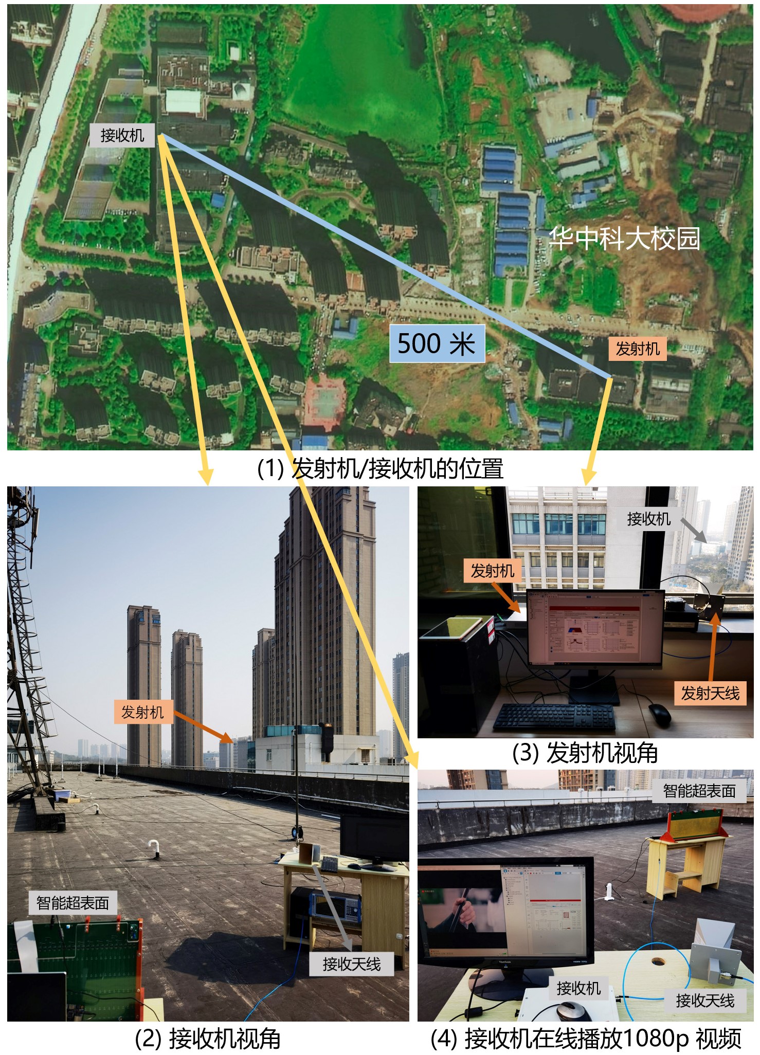 团队将1080p高清视频从我校启明学院亮胜楼通过无线信号传输至500米之外的原光电国家研究中心,并基于智能超表面技术实现了接收端信号功率的大幅度提升,从而实现视频流的在线播放。