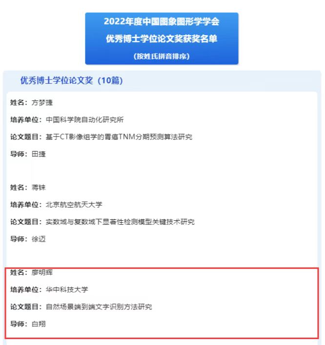 2021届博士,导师为白翔教授,以第一作者身份在TPAMI,TIP,CVPR,ECCV,AAAI等顶级期刊会议发表论文十余篇,其中ESI高被引论文2篇。谷歌学术引用数超3400,GitHub开源代码star总数超4000。获得CSIG自然科学奖一等奖、CCF-CV学术新锐奖、第五届中国互联网+大学生创新创业大赛国赛金奖、AI华人新星百强、AI 2000人工智能全球最具影响力学者榜单。该论文主要研究了自然场景文字检测与识别,提出了TextBoxes系列文字检测算法、DBNet系列文字检测算法、Mask TextSpotter系列端到端文字识别算法等多个系列的工作,其中DBNet文字检测算法是业界主流的文字检测算法,被广泛应用于各大公司的OCR产品和业务中,包括华为手机、腾讯微信、华为云、百度、OpenCV等。