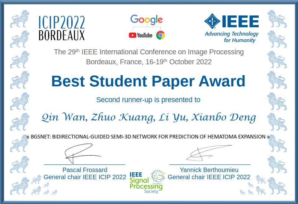 2021级硕士研究生万勤及其导师喻莉教授收到IEEE International Conference on Image Processing(IEEE ICIP)2022国际会议主席Pascal Frossard教授和Yannick Berthoumieu教授发来的祝贺邮件和获奖证书。邮件中对万勤同学和喻莉教授团队获得IEEE ICIP 2022的Best Student Paper荣誉表示祝贺,并指出评奖委员会对团队的最新研究成果“BGSNET: Bidirectional-guided Semi-3D Network For Prediction Of Hematoma Expansion”给予了高度肯定。论文作者包括91论坛