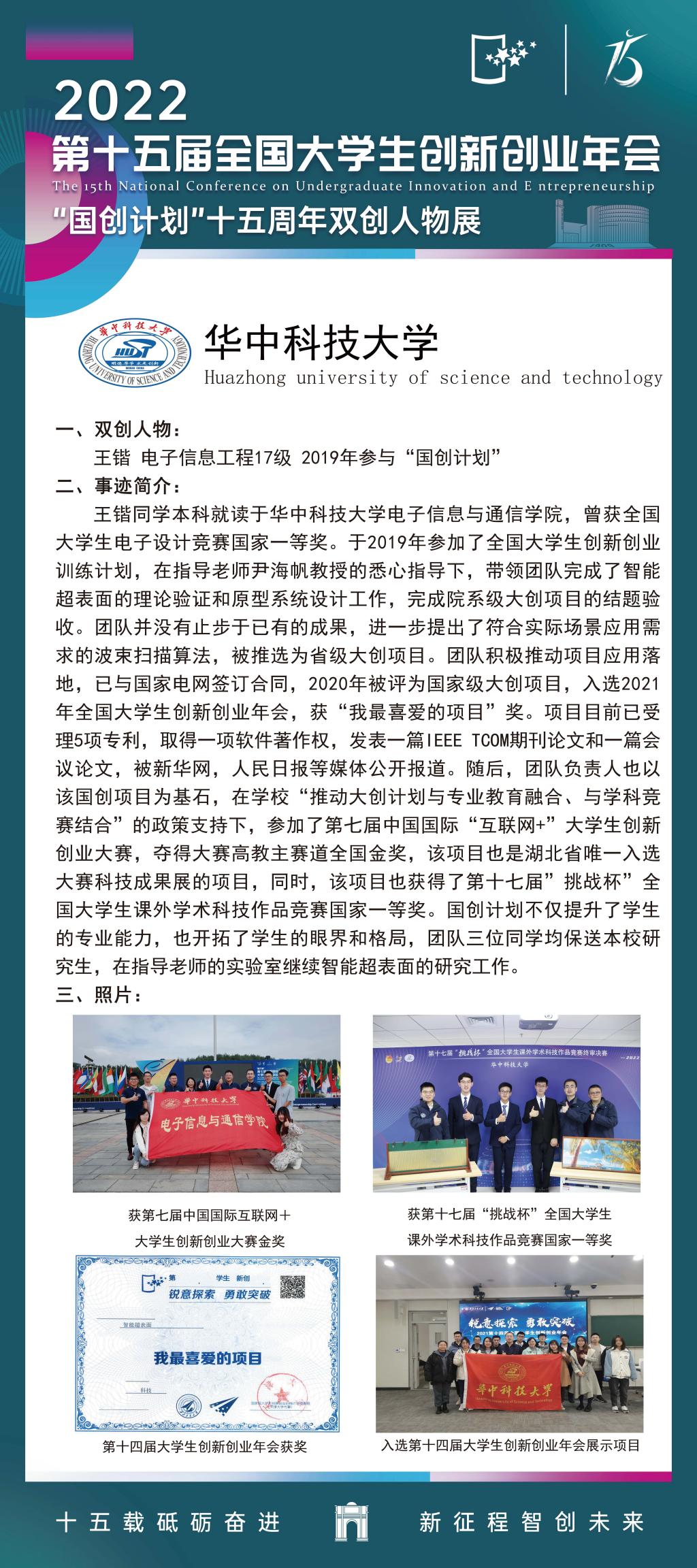 ,曾获全国大学生电子设计竞赛国家一等奖。于2019年参加了全国大学生创新创业训练计划,在指导老师尹海帆教授的悉心指导下,带领团队完成了智能超表面的理论验证和原型系统设计工作,完成院系级大创项目的结题验收。团队并没有止步于已有的成果,进一步提出了符合实际场景应用需求的波束扫描算法,被推选为省级大创项目。团队积极推动项目应用落地,已与国家电网签订合同,2020年被评为国家级大创项目,入选2021年全国大学生创新创业年会,获“我最喜爱的项目”奖。项目目前已受理5项专利,取得一项软件著作权,发表一篇IEEE TCOM期刊论文和一篇会议论文,被新华网,人民日报等媒体公开报道。随后,团队负责人也以该国创项目为基石,在学校“推动大创计划与专业教育融合、与学科竞赛结合”的政策支持下,参加了第七届中国国际“互联网+”大学生创新创业大赛,夺得大赛高教主赛道全国金奖,该项目也是湖北省唯一入选大赛科技成果展的项目。国创计划不仅提升了学生的专业能力,也开拓了学生的眼界和格局,团队三位同学均保送本校研究生,在指导老师的实验室继续智能超表面的研究工作。