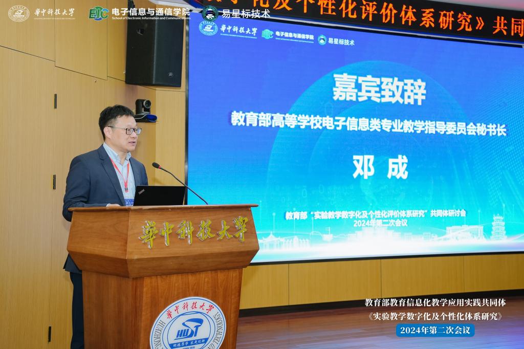 教育部高等教育电子信息指导委员会秘书长邓成教授在致辞中指出,实验教学数字化和个性化评价体系的建立是推动AI辅助实验教学的重要途径。共同体为高校搭建了一个共享、共建的交流平台,希望通过大会的平台促使成员之间交流,进一步推动实验教学持续创新,不断丰富和完善电子信息类人才培养体系。