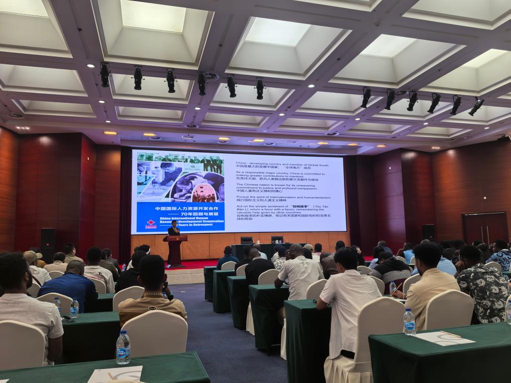 的 68 名 “一带一路” 沿线国家国际学生,一场主题为《中国国际人力资源开发合作 ——70 年回顾与展望》的精彩讲座在这里开启。在讲座中,商务部国际研修学院项目管理一处处长翟俊峰对 70 年来中国援外人力资源发展历程进行了系统梳理,从经济建设到文化交流,从医疗援助到教育合作,全方位呈现了中国在 12 大关键领域取得的卓越成就,生动展现了中国与世界各国携手共进、实现共赢的坚实步伐。