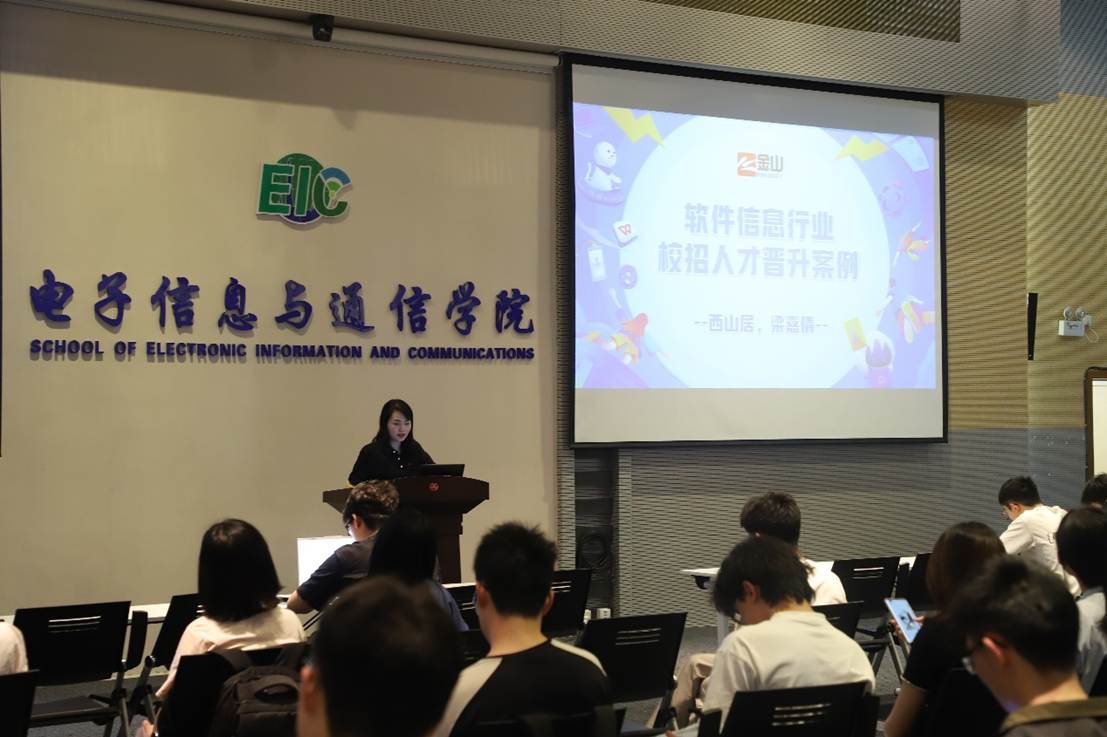 活动首环节为“软件信息行业大学生职业规划漫谈”,由金山软件公司(KINGSOFT)资深人力资源专家徐霞主讲。徐霞老师以“为什么需要了解软件信息行业”为切入点,通过讲述金山软件董事长雷军的创业故事、解析软件行业占我国GDP比重达9.8%的现状,以及“省时间多路径”的行业特征,引导学生思考行业认知对职业发展的价值。在互动交流中,学生们围绕“行业如何助力个人成长”展开讨论,进一步明晰了专业与职业的衔接路径。