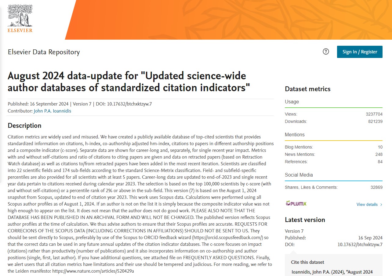 近日,爱思唯尔(Elsevier)与美国斯坦福大学(Stanford University)更新了标准引文指标的全科学作者数据库,发布了“2024年度全球前2%顶尖科学家榜单“(World’s Top 2% Scientists 2024)。榜单分为“终身科学影响力榜单”--关注整个学术生涯迄今的影响力,和“年度科学影响力榜单”--聚焦本年度(2024年)的学术成就。